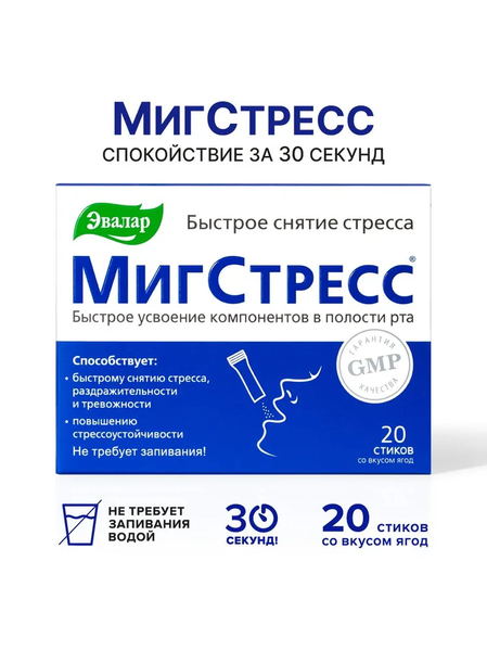 «МигСтресс» от компании «Эвалар» – это инновационное и эффективное современное средство для максимально быстрого снятия стресса в удобной и легкодоступной форме порошка для рассасывания. Всего 1 стик – чтобы быстро успокоиться, вернуть самообладание и контроль над эмоциями.