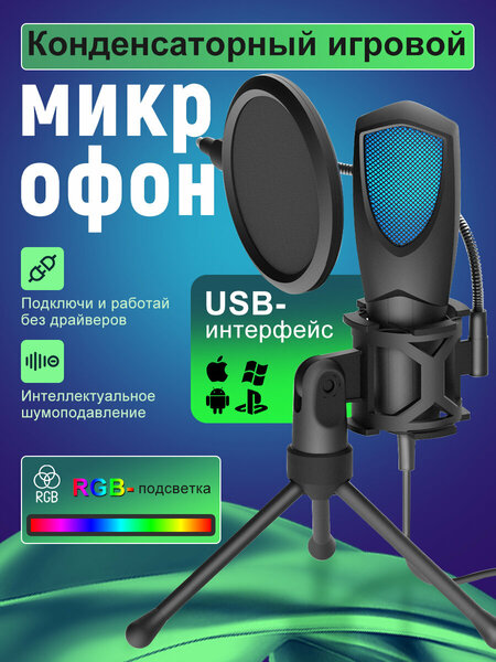 Микрофон для компьютера, конденсаторный USB Микрофон, микрофон студийный для с RGB-подсветкой, для стримов, подкастов