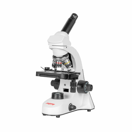 Монокулярный биологический микроскоп. Увеличение от 40х до 2000х, максимальное до 4000х. Наблюдения в проходящем и отраженном свете. Револьверное устройство на 4 объектива. Тонкая фокусировка со шкалой 1 мкм, механический двухкоординатный столик. Питание от сети и от батарей. В комплекте жесткий кейс и мини-лаборатория с препаратами и принадлежностями.