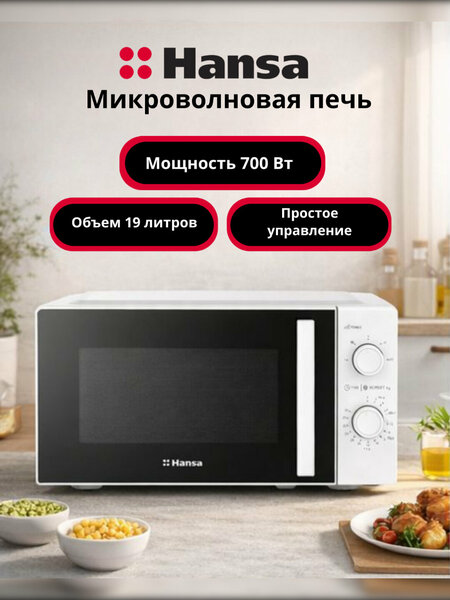 Микроволновая печь Hansa AMMF19M1WH — идеальный помощник на вашей кухне! Стильная, компактная и удобная, она сочетает в себе надёжность, простоту и функциональность. С мощностью 1000 Вт и объёмом камеры 19 литров вы сможете быстро разогреть или приготовить любимые блюда для всей семьи. Механическое управление с поворотными переключателями делает использование лёгким и интуитивно понятным, а 4 уровня мощности позволяют идеально подстроиться под любые продукты. Преимущества: Быстро и равномерно: мощность 1000 Вт обеспечивает идеальный прогрев блюд. Простота управления: интуитивно понятные поворотные переключатели. Компактность: идеально для любых кухонь, экономит пространство. Контроль за процессом: поворотный стол и подсветка камеры позволяют наблюдать за готовкой. Элегантный дизайн: классический белый цвет гармонично впишется в любой интерьер. Характеристики: Объём камеры: 19 л Мощность: 1000 Вт Тип управления: механическое Уровни мощности: 4 Тип установки: отдельно стоящая Внутреннее покрытие: эмаль