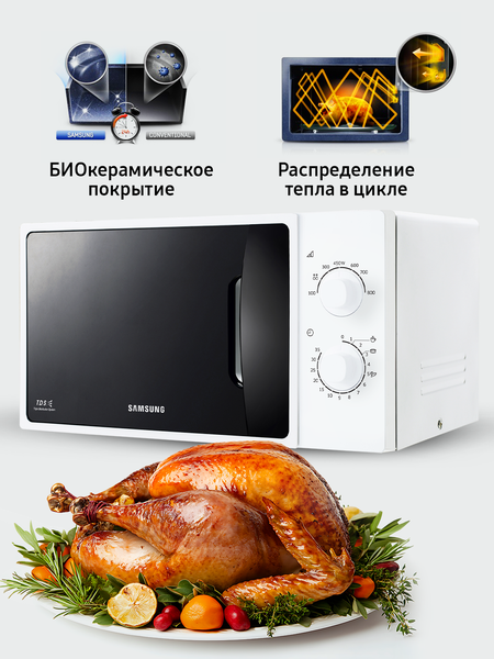 Микроволновая печь Samsung ME81ARW имеет камеру объемом в 23 л, что позволяет готовить большие порции за одну сессию. Диаметр поддона очень велик (288 мм). так что Вы сможете поставить даже широкое блюдо или посуду с нестандартной формой дна. Устройство покрыто внутри специальной керамической эмалью. Это экологичное вещество, которое обеспечивает легкую уборку и мало подвержено воздействию внешних факторов. С таким покрытием бактерии не размножаются внутри прибора, и Ваша еда остается такой же полезной, как была до приготовления. Мощность этой модели – 800 Вт. Размер прежний - объем большеБольшинство покупателей хочет, чтобы их микроволновая печь обладала большой вместительностью, но в то же время была компактной. По высоте и ширине данная модель не отличается от 20-литровой, глубина печи увеличилась всего на 12 мм, за счет чего внутренний объем увеличился на 3 литра. Расширилась и полезная площадь камеры: теперь в печи могут с легкостью уместиться блюда до 288 мм в диаметре. БИОкерамическое покрытиеВо всех микроволновых печах Samsung, используется БИОкерамическое покрытие камеры. Этот материал экологически безопасен, его легко очищать от загрязнений. Он в 7 раз более устойчив к царапинам, чем, например, нержавеющая сталь. Покрытие прочное и гладкое, на нем почти не остается нагара. БИОкерамика обладает низкой теплопроводностью, это сокращает время приготовления и уменьшает теплопотери. Кроме того, БИОкерамическое покрытие обладает ещё одним полезным свойством — материал препятствует размножению бактерий на 99.9%, что доказано исследованиями Лаборатории Хоэнштейн, Германия. Равномерное распределение теплаИнженеры компании Samsung постоянно совершенствуют и улучшают рабочие характеристики своей продукции, используя для этого самые новейшие технологии. Наша уникальная система тройного распределения микроволн (Triple Distribution System) обеспечивает равномерный прогрев продуктов, начиная от пиццы и кончая нагревом стакана молока. Пользуясь нашими микроволновыми печами, вы оцените удобство и комфорт процесса приготовления самых разнообразных блюд.