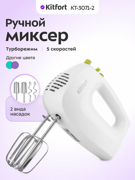 КТ-3071 — ручной миксер, который поможет вам смешать ингредиенты, взбить яичный белок или сливки, приготовить соус, крем, мусс, замесить тесто для выпечки. Прибор оснащен двумя комплектами насадок: венчики подходят для взбивания ингредиентов и замеса жидкого теста для блинов, вафель или бисквитов, а крюки — для замеса более густого теста, например песочного или дрожжевого. Насадки легко снимаются с моторного блока, поэтому уход за устройством не составит труда. Миксер оснащен 5 скоростями работы и турборежимом, благодаря чему вы сможете выбрать подходящую скорость для взбивания или смешивания ингредиентов. Регулятор скорости и кнопка турборежима расположены на рукоятке миксера, поэтому переключить скорость во время работы будет легко и удобно. Миксер прост в управлении: установите подходящую пару насадок, выберите нужную скорость с помощью регулятора и приступайте к приготовлению любимых блюд. Благодаря компактным размерам миксер KT-3071 не займет много места на вашей кухне, а легкий вес устройства позволит сделать процесс готовки еще более приятным.