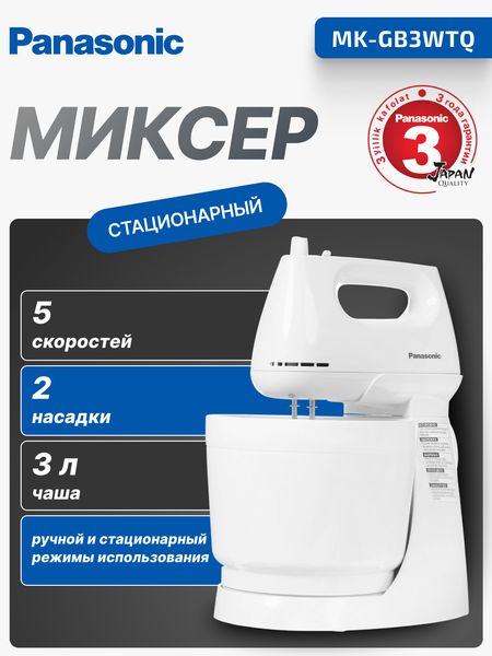 Стационарный-ручной миксер Panasonic MK-GB3WTQ - это сочетание функциональности и удобства. Миксер оснащен двумя насадками: венчиком для взбивания и крючками для замешивания теста. Это позволяет использовать его для приготовления разнообразных блюд, от взбивания крема до замешивания теста для печенья. Корпус миксера выполнен из пластика, что делает его легким и прочным. Вес устройства составляет всего 2 кг, а длина сетевого шнура - 1,7 метра, что обеспечивает свободу перемещения по кухне. Особенностью конструкции миксера является вращение чаши, кнопка отсоединения насадок, защитная крышка на чашу, приспособление для хранения насадок и прорезиненные ножки. Это обеспечивает удобство и безопасность использования. Миксер имеет пять скоростей, что позволяет выбрать оптимальный режим для каждого блюда. Импульсный режим позволяет быстро и эффективно смешивать ингредиенты. В комплекте с миксером идут две насадки: венчик для взбивания и крючки для замешивания теста. Это позволяет использовать его для приготовления разнообразных блюд, от взбивания крема до замешивания теста для печенья. Миксер Panasonic MK-GB3WTQ - это надежный и функциональный помощник на вашей кухне.