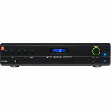 JBL VMA1120 - Микшер-усилитель, мощность усилителя при 100 В и 70 В, или 4 Ом/8 Ом - 120 Вт, 5 входов, 1 выход, 20-20000 Гц, эквалайзер, выходы на разъемах Screw terminal, фантомное питание, Bluetooth, USB, оборудование для монтажа в рэковую стойку в комплекте.