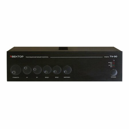 Вектор ТУ-30 Компактный микшер-усилитель. Мощность 30Вт. Выход 100В 4-16Ом, 1 микр и 2 AUX входа, 1 AUX выход. Питание 220В. Размеры 330 х 88 х 250 мм. Вес 3,6 кг.