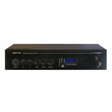 Вектор ТУ-480М Компактный комбинированный микшер-усилитель. Мощность 480Вт. Выход 100В 4-16Ом, 1 микр и 2 AUX входа, 1 AUX выход. Цифровой FM тюнер, MP3 плеер, USB, SD, Bluetooth. Питание 220В. Размеры 482 х 88 х 410 мм. Вес кг.