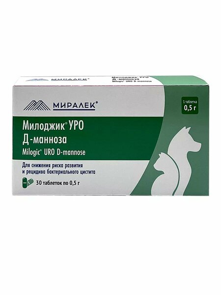 Назначение: «Функциональное лакомство Милоджик Уро Д-манноза» помогает предотвратить развитие бактериального цистита и улучшить состояние мочевого пузыря. Благодаря воздействию Д-маннозы бактерии, вызывающие цистит, теряют подвижность и патогенность. При этом полезная микрофлора не страдает. Более того, Милоджик УРО с Д-маннозой способствует росту полезных молочнокислых бактерий. Милоджик УРО безопасно для пациентов с сахарным диабетом, так как не повышает уровень сахара в крови. Милоджик УРО с Д-маннозой можно назначать при рецидивирующем и спорадическом цистите, при бессимптомной бактурии. Состав: «Функциональное лакомство Милоджик Уро Д-манноза» содержит в своем составе: D-манноза, диоксид кремния, стеарат магния. В 100 г продукта содержится: углеводов – 98 г, белков – 0 г, жиров – 0 г. Энергетическая ценность в 100 г: 158 ккал. Описание: Двояковыпуклые таблетки овальной формы розового цвета с белыми вкраплениями, сладковатого вкуса. Противопоказания: Отсутствуют. Порядок применения и дозировка:«Функциональное лакомство Милоджик Уро Д-манноза» для кошек и собак рекомендуется давать 1 раз в сутки из расчета 1 таблетка на каждые 5 кг веса животного. Лакомство можно давать как вместе с ежедневным рационом, так и отдельно. Предназначено для систематического употребления при условии отсутствия побочных реакций у животного. Срок годности средства «Функциональное лакомство Милоджик Уро Д-манноза» при соблюдении условий хранения в закрытой упаковке производителя – 2 года со дня производства.