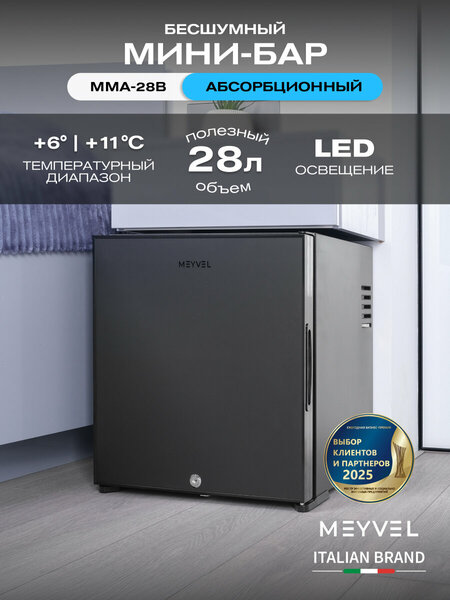 Абсорбционный минибар Meyvel MMA-28B Мини-бар Meyvel MMA-28B — это сочетание удобства, продуманного дизайна и современных технологий. Модель может быть как отдельностоящей, так и встраиваемой. Первый вариант предоставляет свободу размещения – его можно поставить в любом удобном месте, будь то гостиничный номер, офис, спальня или кабинет руководителя. Второй означает, что устройство получится аккуратно установить в нише мебели или под столешницей, скрыв от глаз и сэкономив пространство. Бесшумная работа В абсорбционной системе охлаждения отсутствуют движущиеся части, поэтому прибор работает бесшумно, что важно для гостиниц, спален и офисов, где тишина играет важную роль. Мини-бар не создает вибраций и издает неприятных звуков, не нарушая сон или рабочую атмосферу. Поддерживаемый температурный диапазон от +6 до +11°C обеспечивает комфортное хранение напитков и продуктов без риска замерзания или перегрева. Продуманное внутреннее пространство Внутри устройства есть удобные полки, которые регулируются по высоте. На основной полке размещают бутылки и продукты, а две дверные создают дополнительное пространство для хранения небольших упаковок или напитков. Внутреннее освещение помогает быстро найти нужные вещи даже в темное время суток. Автоматическая разморозка избавляет от необходимости вручную удалять наледь, что значительно упрощает уход за устройством. Дверь перенавешивается, поэтому оборудование адаптируется под любые интерьерные решения. Мини-бар Meyvel MMA-28B — это стильное, практичное и бесшумное решение для хранения напитков и продуктов в любых условиях. Он сочетает инновационные технологии и удобство, делая жизнь немного проще и комфортнее.