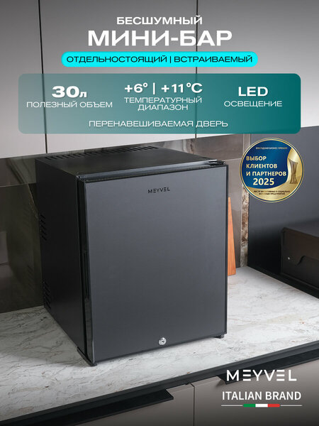 Абсорбционный минибар Meyvel MMA-30B Мини-бар Meyvel MMA-30B — это сочетание удобства, продуманного дизайна и современных технологий. Модель может быть как отдельностоящей, так и встраиваемой. Первый вариант предоставляет свободу размещения – его можно поставить в любом удобном месте, будь то гостиничный номер, офис, спальня или кабинет руководителя. Второй означает, что устройство получится аккуратно установить в нише мебели или под столешницей, скрыв от глаз и сэкономив пространство. Бесшумная работа В абсорбционной системе охлаждения отсутствуют движущиеся части, поэтому прибор работает бесшумно, что важно для гостиниц, спален и офисов, где тишина играет важную роль. Мини-бар не создает вибраций и издает неприятных звуков, не нарушая сон или рабочую атмосферу. Поддерживаемый температурный диапазон от +6 до +11°C обеспечивает комфортное хранение напитков и продуктов без риска замерзания или перегрева. Продуманное внутреннее пространство При установке мини-бара с каждой стороны должен быть зазор не менее 50 мм. Установка скользящего шарнира не предусмотрена. Внутри устройства есть удобные полки, которые регулируются по высоте. На двух основных полках размещают бутылки и продукты, а две дверные создают дополнительное пространство для хранения небольших упаковок или напитков. Внутреннее освещение помогает быстро найти нужные вещи даже в темное время суток. Автоматическая разморозка избавляет от необходимости вручную удалять наледь, что значительно упрощает уход за устройством. Дверь перенавешивается, поэтому оборудование адаптируется под любые интерьерные решения. Мини-бар Meyvel MMA-30B — это стильное, практичное и бесшумное решение для хранения напитков и продуктов в любых условиях. Он сочетает инновационные технологии и удобство, делая жизнь немного проще и комфортнее.