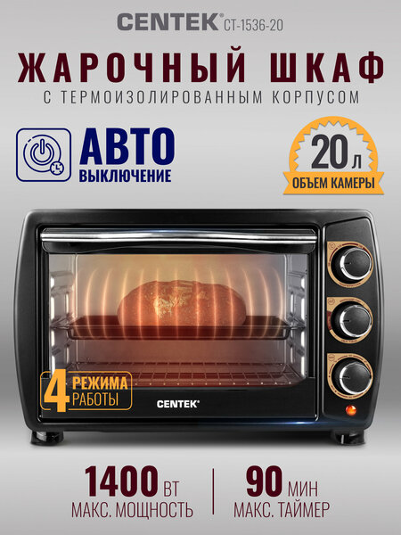 Духовка электрическая настольная Centek CT-1536-20 - это идеальное решение для тех, кто хочет приготовить вкусные блюда без лишних затрат времени и денег. Эта печь имеет объем 20 литров, что позволяет готовить большие порции пищи одновременно. Мини-печь электрическая Centek CT-1536-20 оснащена четырьмя режимами работы: верхний нагрев, верхний+нижний нагрев, нижний нагрев и конвекция. Это значит, что вы можете выбирать оптимальный режим для каждого блюда и получать отличные результаты. Также эта печь имеет звуковой таймер с отключением, который поможет вам не забывать о готовящейся еде. Кроме того, она оснащена металлическим эмалированным противнем и стальной хромированной жарочной решеткой, которые обеспечивают высокую эффективность приготовления пищи. Мини-печь электрическая Centek CT-1536-20 имеет гарантийный срок 12 месяцев и срок службы 5 лет. Она также оснащена системой защиты от перегрузки (автоматический предохранитель), которая обеспечивает безопасную работу печи. Эта печь является отличным выбором для тех, кто хочет приготовить вкусные блюда без лишних затрат времени и денег. Она имеет высокую эффективность приготовления пищи благодаря своим четырем режимам работы и металлическому эмалированному противню и стальной хромированной жарочной решетке.