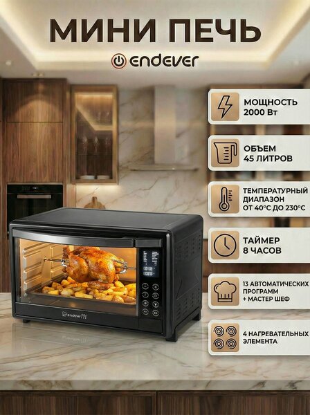 Перед Вами мини-печь ENDEVER Danko-4045 с большим функционалом, которая способна будет приятно удивить Вас и избавить от многих проблем при готовке на Вашей кухне, будь она дома или на даче. Начнем с элегантного внешнего вида в классическом черном цвете со вставками из полированной стали. Управление осуществляется при помощи сенсорных кнопок и LED дисплея, на котором отображается вся необходимая информация. Управление интуитивное и простое, Вы с легкостью разберетесь в нем. Небольшие габариты позволят установить мини-печь в любом месте на Вашей кухне. Прорезиненные ножки способны удержать мини-печь на любой поверхности. Мини-печь ENDEVER Danko-4045 обладает хорошими техническими характеристиками и большими функциональными возможностями. Мощность составляет 2000 Вт, 4 нагревательных элемента, по два сверху и снизу позволят приготовить быстро и равномерно Ваши блюда. Дополнительно оснащена режимом конвекции и гриля. При объеме 45 литров Вы сможете приготовить солидные по своему размеру блюда из разного вида мяса, в плоть до целых тушек, например курицы или мелкой дичи. Режим гриля позволит равномерно приготовить со всех сторон Ваш кулинарный шедевр. А 13 автоматических программ помогут в этом. Также предусмотрена программа «мастер ШЕФ», которая предназначена для выбора параметров в ручном режиме, для тех, кто хочет готовить сам по своим рецептам. Регулировка температуры, в зависимости от выбранного режима, от 40 до 230 градусов. Наличие внутренней подсветки облегчит Вам контроль за процессом приготовления. Таймер работы до 8 часов с функцией автоотключения и звуковым сигналом позволит установить оптимальное время приготовления и всегда предупредит о готовности блюда. Дополнительно с мини-печью ENDEVER Danko-4045 поставляются противень, хромированная решетка, ухват для противня и решетки, вертел и держатель вертела. Расширенная гарантия 18 месяцев защитит Вас от ненужных проблем и позволит насладиться использованием мини-печи на полную катушку.