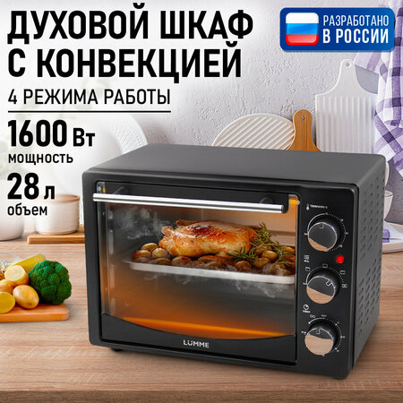 Мощность: 1600 Вт, Объем: 28 л, Конвекция, 4 нагревательных элемента,4 режима работы, Регулировка температуры: 70°C - 230°C, таймер до 60 мин, Сигнал об окончании приготовления, Автоматическое выключение, Аксессуары: решетка, противень, ручка для извлечения. Четыре мощных нагревательных элемента быстро прогревают большую камеру, поэтому электрический духовой шкаф LUMME поможет Вам приготовить самые вкусные горячие блюда, чудесную домашнюю выпечку с румяной корочкой и бесчисленное множество разнообразных кулинарных шедевров без потери времени. Вы сможете выбирать способ приготовления, располагая противень и решетку на любом из трех уровней и включая один из трёх режимов нагрева (верхний, нижний, верхний + нижний). Вместительная камера объемом 28 литров позволит одновременно готовить несколько блюд и вмещает продукты большого размера, таких как целая тушка птицы, большой мясной рулет или пирог для всей семьи. Режим конвекции избавляет от необходимости перемещения блюда и противня во время приготовления, так как обеспечивает постоянную циркуляцию горячего воздуха по всей внутренней камере, за счет чего достигается одинаковая температура нагрева блюда со всех сторон, что позволяет пище запекаться и покрываться румяной корочкой равномерно по всей поверхности. Встроенный таймер позволит с легкостью отслеживать время приготовления блюд, при этом, Вы сможете отвлечься на другие дела, так как по истечении установленного времени, духовой шкаф выключится автоматически, а звуковой сигнал об окончании приготовления напомнит о готовности блюда. Надёжные компоненты прибора обеспечат длительный срок службы и бесперебойную работу. Аксессуары в комплекте: решетка, противень, ручка для извлечения противня/решетки, поддон для сбора крошек. Духовой шкаф настольный для дачи, мини печь электрическая для офиса, на дачу, духовка на кухню.