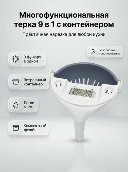 Многофункциональная терка 9 в 1 с контейнером - это незаменимый помощник на вашей кухне. Терка оснащена девятью различными функциями, что позволяет вам нарезать, шинковать и тереть различные продукты, такие как овощи, фрукты, сыр и шоколад. Это значительно упрощает процесс приготовления блюд и экономит ваше время. В комплект входят сменные насадки для нарезки и шинковки, а также контейнер для аккуратного сбора нарезанных продуктов. Это позволяет вам поддерживать чистоту на кухне и сохранять порядок на рабочем месте. Компактная конструкция терки экономит место на вашей кухне, а продуманная форма обеспечивает безопасное и комфортное использование. Терка подходит как для повседневного домашнего применения, так и для профессиональной кухни. Терка изготовлена из нержавеющей стали, что гарантирует долгий срок службы и устойчивость к коррозии. Корпус выполнен из прочного пластика, что делает терку легкой и удобной в использовании. Терка с контейнером станет незаменимым помощником на вашей кухне и облегчит процесс приготовления разнообразных блюд.