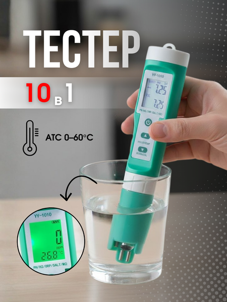 Многофункциональный тестер 10 в 1 ТPH/TDS/EC/ORP/TEMP/M/SG/SalinityМногофункциональный солемер 10 в 1 профессиональное измерение PH, EC, TDS, ОВП, H2, MΩ, фертильности, соли, S.G. Температура. подходит для бытовой питьевой воды, продуктов питания, бассейна, лаборатории и аквариума. Дисплей с большим экраном HD. Большой экран с подсветкой, четкое значение, легко читаемый, подходит для тестирования pH во всех сферах жизниАккумулятор большой емкости. Используйте аккумулятор 3*1,5 В (LR44) для обеспечения питания, долговечности и простоты замены, его можно купить везде. Высокоточный зонд. Благодаря высокочувствительному зонду можно избежать помех магнитного поля в воде, уменьшить ошибки и эффективно предотвратить повреждение зондов во время транспортировки. Автоматическая температурная компенсация. Температура может влиять на уровни считывания, этот тестер имеет автоматическую температурную компенсацию от 0 ° C-60 ° C, которая может гарантировать правильность ваших измерений. Технические характеристики: PHДиапазон измерения: 0,01-14,00 pHРазрешение: 0,01 pHТочность: ± 0,05 pH ЕС: Диапазон измерения: 0-10000 мкс/см, 10,1-200 мс/смРазрешение: 1 мкс/см, 0,1 мс/смТочность: ± 2% полной шкалы. TDS: Диапазон измерения: 0-10000ppm 10,1-200pptРазрешение: 1ppm, 0,1 PPTТочность: ± 2% полной шкалы. ОВП: Диапазон измерения: ± 999 мВРазрешение: 1 мВТочность: ± 2 мВ Н2: Диапазон измерения: 0-2400ppb, 0-2.400ppmРазрешение: 1ppb, 0001 ppmТочность: ± 10ppb, ± 0,01 ppm соль: Диапазон измерения: 0-10000ppm, 10,1-200,0 ppt, 0,01%-25,0%Разрешение: 1ppm, 0,1 ppt, 0,01%Точность: 0,01%-5,00% (± 0,1%), 5,1%-25,00% (± 1%), ± 2% полной шкалы. ТемператураДиапазон измерения: 0 ℃-60 ℃/32-140 ℉Разрешение: 1 ℃/℉Точность: ± 0,5 ℃ Диапазон измерения S. G: 1,000-1,222 Диапазон измерения МОм: 50 Ом-20 МОм Диапазон измерения фертильности: 0-3 Условия эксплуатации: 0 ℃-60 ℃, относительная влажность 100%Батарея: 3*1,5 В (LR44), Не включатьРазмер экрана: 33*24 мм Размер Вес: 183*37*37 мм (7,2*1,5*1,5 дюйма)/90 г (3,2 унции)Дисплей: ЖК-цифровой дисплейПодсветка: подсветка не является обязательнойАвтоматическое отключение: 5 минут