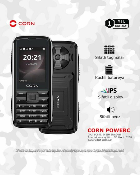 Мобильный телефон CORN Power C — прочный и надёжный кнопочный телефон с усиленным корпусом, предназначенный для активного и повседневного использования. Устройство поддерживает Dual SIM, оснащено IPS-дисплеем, громким динамиком и аккумулятором повышенной ёмкости 2000 мА·ч, обеспечивающим длительное время работы без подзарядки.
