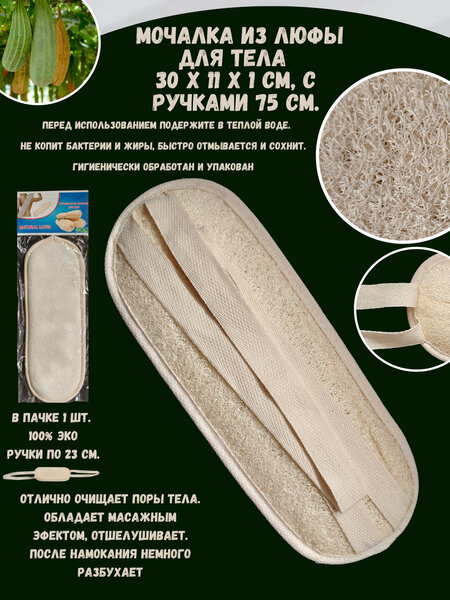 Инструкция по применению: 1. Перед использованием рекомендуется промыть мочалку теплой водой с добавлением небольшого количества порошка (1 чайную ложку). Поскольку мочалка натуральная, имеет свой специфический запах, после промывки запах исчезнит, а мочалка вздуется и станет мягкой. 2. Мыло и гели для душа отлично подходят для купания, поскольку они глубоко проникают в мочалку и обеспечивают длительную пенность. 3. После использования тщательно промойте люфу водой и высушите. 5. Способ хранения: желательно хранить в хорошо проветриваемом месте. Натуральная мочалка из люффы обладает массажным и скрабирующим эффектом, глубоко очищает поры, бережно удаляет ороговевшие частицы кожи, мягко шлифует и придает эластичность коже, повышает кожно-мышечный тонус и обладает антицеллюлитными свойствами. Обладает эффектом естественного пилинга кожи. Используется как органическая косметика для ухода за кожей. После мытья натуральной мочалкой из люффы вы ощутите обновление вашей кожи тела. Удобная форма и размер создадут удобство при уходе за лицом и телом. Жесткая натуральная мочалка отличный вариант для ванны и душа, бани, сауны, для массажа. Возможно использовать как массажную щетку для тела. Применение люффы эффективно воздействует на организм человека, при регулярном массаже (как с сухим и жидким мылом, гелем, шампунем, так и без него) кожа становится упругой и шелковистой. После использования мочалки ваша кожа сияет молодостью и красотой, эффект не хуже, чем после использования скраба. Может использоваться для пилинга в домашних условиях. Эко мочалка для купания гипоаллергенна, подойдет мужчинам и женщинам с проблемной и чувствительной кожей.