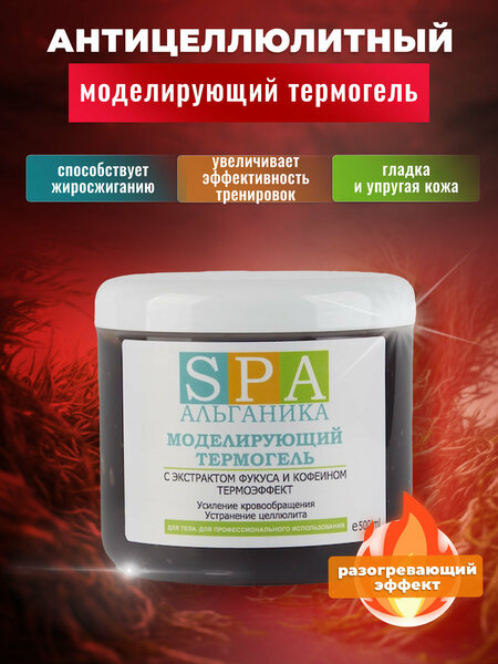 Один из лучших разогревающих гелей в линейке моделирующих средств в уходе за телом. Моделирующее средство специально разработан для активного избавления от излишних объемов и целлюлита. Его действие основано на интенсивном разогреве глубоких слоев кожи, благодаря чему усиливается кровообращение, обмен веществ, выведение токсинов и регенерация клеток. Сразу после нанесения ощущается прилив тепла и, в зависимости от способа использования, тепло может проникать глубоко внутрь, разогревая кожу, мышцы и суставы. Антицеллюлитный гель способствует улучшению контуров фигуры, уменьшает объемы тела и улучшает состояние эпидермиса- эффект непрямого липолитика. Потрясающая эффективность термогеля от spa Альганика, легкость его применения и приятная цена сделали его хитом в линейке моделирующих средств. Термогель можно использовать в качестве самостоятельного антицеллюлитного средства, а так же наносить после проведения холодного обертывания для похудения, что усилит эффект от процедуры. Хорошо работает с несовершенствами, помогает от отеков, от целлюлита, от растяжек, эффективен для похудения живота и боков, бедер. Способы применения: -нанести тонким слоем и массирующими движениями на область живота, бедер. Для получения эффекта паровой бани, после нанесения оберните кожу пленкой для горячего обертывания и утеплите при помощи термоодеяла; -на завершающем этапе обертывания нанести небольшое количество на отдельные участки кожи, дать впитаться; -можно использовать в качестве разогревающего средства перед аэробными видами тренировок, такое дополнительное действие геля позволяет усилить эффект от фитнес занятий; -при проведении активного массажа. Курс массажа с термогелем позволяет избавиться от излишних объемов, придать коже гладкость и упругость. Гель хорошо работает с использованием масла для массажа тела. Для максимального эффекта от спа процедур рекомендуется использовать антицеллюлитный набор косметики: антицеллюлитный скраб и крем для тела линейки спа Альганика.
