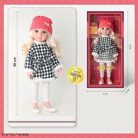 Модная, стильная куколка понравится любой девочке и станет замечательным подарком на любой праздник. Волосы густые, прошиты по всей голове, на голове модная прическа, волосы куклы можно расчесывать и делать различные прически, что позволит проявить ребенку фантазию. Кукла сделана из приятного на ощупь материала. Малышка одета в красивый нежный наряд, одежда снимается полностью. С такой милой куколкой ребенок сможет придумывать различные сюжетно-ролевые игры, что способствует развитию фантазии, мелкую моторику и учит ребенка ответственности. Размер упаковки: 21 х 9,5 х 44 см Рост куклы: 38 см Возраст: 3+