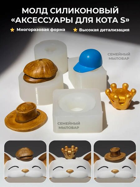 Набор молдов для изготовления аксессуаров для популярной конфетницы в виде кота: молд шляпы, молд кепки, молд короны и молд бейсболки. Данные головные уборы подходят для кота размера S, которого можно изготовить из нашего молда. Объем силиконовой формы короны - 9мл. Объем силиконовой формы шляпы - 11мл. Объем силиконовой формы кепки - 19мл. Объем силиконовой формы бейсболки - 11мл. Данные формы так же можно использовать как молды для любых других целей, например, для изготовления шоколадок или декора из гипса, воска, смол и прочих материалов. Состав молдов - пищевой силикон, он безопасен для организма и подходит для заливки продуктов питания.