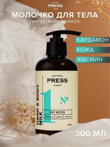 Молочко для тела 300 мл — легкое увлажнение без липкости | Аромат кожи, жасмина и кардамона | Press Gurwitz Perfumerie Легкое парфюмированное молочко для тела увлажняющее от PRESS Perfumerie с нежной кремовой текстурой. Быстро впитывается, не оставляет липкости, идеально подходит для ежедневного ухода. Обогащено витамином Е, пантенолом и маслом ши — увлажняет, питает и придает коже бархатистость. Роскошный аромат №1 с нотами кожи, жасмина и кардамона подарит вам ощущение уверенности и чувственности. ✨ Идеальное увлажнение для тех, кто ценит комфорт и скорость — легкое молочко для тела, которое работает как профессиональный уход молочко для тела парфюмированное 300 мл от PRESS Perfumerie — это ваш выбор, если вы хотите глубоко увлажнить кожу, но при этом не желаете ощущения липкости или долгого впитывания. Идеально подходит для ежедневного применения — утром перед работой, вечером после душа или даже в течение дня. молочко для тела увлажнение и питание: ✅ Легкая кремовая текстура — нежная, воздушная, не тяжелая, как баттер или плотный крем. ✅ Не оставляет липкости — идеально для использования перед одеждой, не пачкает одежду и не требует длительного ожидания. ✅ Быстро впитывается — уже через несколько секунд кожа готова к нанесению одежды или макияжа. ✅ Подходит для всех типов кожи — особенно для нормальной и комбинированной, а также для тех, кто не любит тяжелые текстуры. эффективный состав для здоровой И бархатистой кожи Витамин Е — мощный антиоксидант, который помогает удерживать влагу в эпидермисе, поддерживая мягкость и эластичность кожи. Защищает от внешних воздействий. Пантенол (провитамин B5) — успокаивает кожу, делает её более гладкой и нежной, пропадает шелушение и чувство стянутости. Особенно полезен после душа или солнечных ванн. Масло Ши — натуральный увлажнитель и питатель. Насыщает кожу полезными веществами, возвращает ей мягкость и здоровый вид. уникальный аромат №1 — чувственность И уверенность В каждом применении Откройте для себя аромат, созданный специально для тех, кто ценит глубину и характер: Кожа — теплая, терпкая, с лёгкой пряностью — создаёт ощущение соблазнительности и уверенности. Жасмин — цветочный, сладкий, чувственный — добавляет женственности и романтики. Кардамон — пряный, свежий, с нотками цитрусовых — придаёт аромату энергию и яркость. Это не просто уход — это ритуал самоутверждения. Аромат остаётся на коже долгое время, создавая вокруг вас ауру элегантности и силы. результаты применения: ✔ Увлажняет и питает — устраняет сухость и стянутость ✔ Дарит коже заряд бодрости — ощущение свежести и комфорта ✔ Делает кожу бархатистой — мягкая, гладкая, приятная на ощупь ✔ Оставляет стойкий роскошный аромат — аромат №1 запомнится надолго. объём И удобство использования Объём: 300 мл — щедрого объема, хватит надолго даже при ежедневном использовании. Удобный дозатор — экономично, гигиенично, легко наносить одной рукой. Легкая упаковка — можно взять с собой в поездку, в спортзал или на работу. почему выбирают Press Gurwitz Perfumerie №1? ✔ Легкое молочко без липкости — идеально для активного образа жизни ✔ Быстрое впитывание — не задерживает вас перед выходом из дома ✔ Роскошный аромат №1 — чувственный, уверенный, запоминающийся ✔ Натуральные компоненты — витамин Е, пантенол, масло ши ✔ Подходит для всех типов кожи — унив