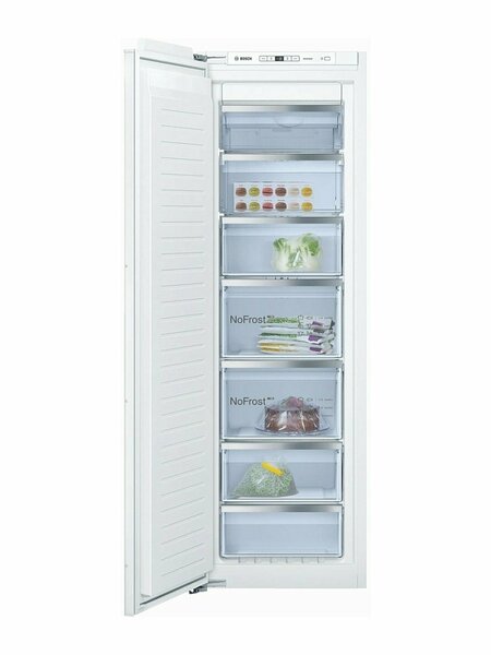Морозильник Bosch GIN81AEF0U - это встраиваемый морозильник с общим полезным объемом 211 литров. Он оснащен двумя ящиками BigBox и пятью прозрачными боксами, что позволяет удобно размещать продукты внутри прибора. Панель с LCD дисплеем, интегрированная во внутренней стороне морозильной камеры, позволяет настроить рабочую температуру. Техника плоских шарниров обеспечивает мягкое и бесшумное закрытие двери. В сутки морозильник способен заморозить до 20 кг продуктов. Морозильник Bosch GIN81AEF0U имеет класс энергопотребления A++, что говорит о его энергоэффективности. ЖК-дисплей и звуковая индикация температуры, открытой двери и повышения температуры делают использование прибора удобным и интуитивно понятным. В комплекте с морозильником идут аккумуляторы холода и форма для приготовления кубиков льда. Морозильник выполнен в белом цвете, имеет ширину 55,8 см, глубину 54,5 см и высоту 177,2 см. Вес нетто составляет 64,3 кг.