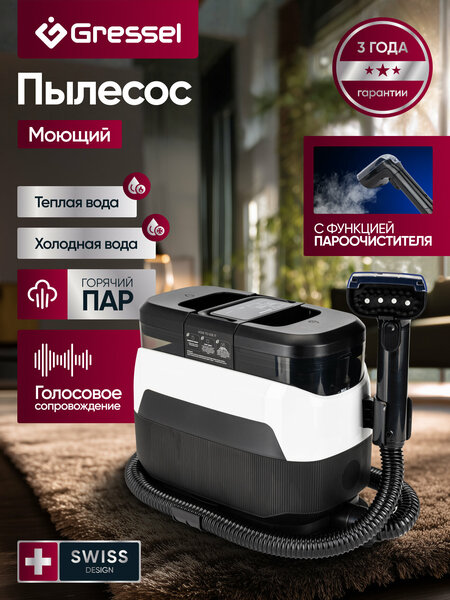 Моющий пылесос Gressel GVC-7305 — это универсальное решение для глубокой и бережной уборки с возможностью пароочистки. Он сочетает в себе функции влажной уборки, подогрева воды, отпаривания и паровой дезинфекции, что делает его особенно полезным в семьях с детьми, домашними животными или при высокой чувствительности к бытовой химии. Пылесос оснащён двумя раздельными баками: 1,3 л для чистой и 1,2 л для грязной воды. Выбирайте один из четырёх режимов — холодная или горячая вода, очистка паром с одновременным всасыванием, либо режим «только пар». Подогрев воды до 60 °C помогает быстро растворять загрязнения и жир, а пар под давлением 2,5 бара глубоко очищает тканевые поверхности, устраняет запахи и уничтожает микробы. GVC-7305 не просто моет — он работает как полноценный пароочиститель. Отпарьте шторы или диван, освежите матрас, очистите плитку или стекло без разводов и химии. Моющая насадка с щёткой подходит для ковров и мебели, а специальная насадка для окон справляется со стеклом, зеркалами и плиткой. Для деликатных материалов предусмотрены насадки с мягкой тканью и точечная базовая — для точечной обработки труднодоступных участков. Устройство оснащено сенсорным управлением и голосовым помощником, который сообщает, какой режим активен, когда нужно долить воду или опустошить бак. Мощность 1700 Вт и сила всасывания 13 кПа обеспечивают эффективную и быструю уборку. Пылесос легко справляется с шерстью, пылью, жирными пятнами и неприятными запахами. Шнур длиной 4 метра и шланг 1,2 м обеспечивают удобство в использовании. Прибор поставляется с полным набором насадок, инструкцией и гарантией на 3 года.