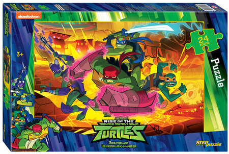 Пазл «Черепашки Ниндзя» основан на сценах из мультфильма «Эволюция Черепашек-Ниндзя» от корпорации Никелодеон. На его картинке мы видим всех четырёх супер-героев. Пазл состоит из 24 крупных деталей, размер одного элемента сопоставим с ладонью взрослого человека. Ребенку будет легко с ними играть и составлять картинку, также большие детали будет сложно потерять. Характеристики пазла: крупные детали пазла (8×8,5 см); размер собранного изображения - 50*34,5 см; материал – картон; качественное изображение; экологически чистые, нетоксичные материалы (компания Step Puzzle гарантирует высокое качество пазла и точность подгонки). Для кого? Пазл подходит для детей от 3 лет. Яркий пазл «Черепашки Ниндзя» точно понравится всем фанатом этого мульт-сериала! Рекомендуем приобрести специальный клей для пазлов, чтобы скрепить детали мозаики между собой и получить цельную картину.