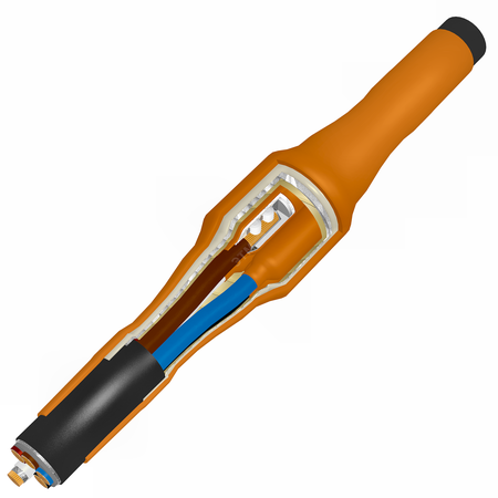 Муфта соединительная для трехжильного кабеля с пластмассовой изоляцией с броней с огнестойким герметиком, огнестойкая, не распространяющая горение, не содержащая галогенов, на напряжение до 1 кВ.