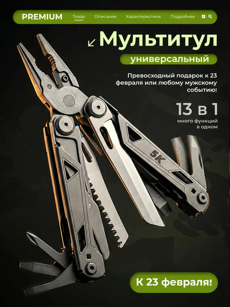 Мультитул Five Knives MQ065, 13 функций это доступное и многофункциональное решение для всех ваших задач как в городе, так и за его пределами. Он станет незаменимым помощником как для отдыха на природе, так и для повседневных задач в городской среде. Список функций мультитула: Плоскогубцы Кусачки Шило Крестовая отвёртка Напильник Нож Пила Ножницы Консервная открывашка Малая шлицевая отвёртка Открывалка для бутылок Шлицевая отвёртка Стропорез В нашем магазине вы найдете разнообразие моделей ножей, включая нож складной, который идеально подходит для активного отдыха. Особенно популярны нож туристический, а также нож выкидной, который легко использовать в любых условиях. Для тех, кто предпочитает компактность, есть ножик складной туристический, которые удобно носить с собой. Мы также предлагаем нож с чехлом и нож раскладной для комфортного хранения и транспортировки. Для настоящих ценителей качества у нас есть швейцарский нож, которые подойдут для любых задач. Если вам нужен надежный инструмент для защиты, а для любителей рыбалки — нож для рыбалки и нож походный. И не забудьте о ноже туристическом складном, который легко помещается в рюкзак и всегда под рукой в путешествиях. Отлично подходит как подарок мужчине. Мультитул туристический Honor Urban Tool 15 в 1, нержавеющая сталь — это универсальный помощник для туристов, а в некоторых случаях и строительный инструмент. Он включает в себя нож, плоскогубцы, отвертку и множество других инструментов. Этот компактный набор легко помещается в чехол. Пассатижи обеспечивают надежный захват, а кусачки позволяют выполнять мелкие работы. Лезвие имеет два типа заточки: plain и серрейторное, что делает его полезным для разных задач. Можно использовать как рыболовный инструмент, в походах или при ремонте. Находясь под рукой, мультитул всегда поможет решить любые непредвиденные ситуации. Инструменты не только функциональны, но и просты в использовании. Для комфортной переноски в комплекте чехол из нейлона. Он защитит мультитул от повреждений во время транспортировки в рюкзаке или сумке. В этом наборе есть все необходимое для ремонта и обслуживания устройств или электроники. Дополнительно мультитул включает ножницы и пилу для выполнения более сложных задач. Благодаря продуманной конструкции можно легко получать доступ к нужным инструментам без лишних усилий. А еще этот аксессуар станет отличным подарком отцу или другу на любой случай жизни. Компактный дизайн позволяет носить его с собой повсюду: в наручном кармане куртки, рюкзаке или даже в машине. Это отличный выбор для людей, которые ценят разнообразие функций в одном устройстве. Для охотников данный инструмент значительно упростит процесс разделки добычи или подготовки материалов на месте ловли рыбы. Удобные насадки могут помочь при работе с кабелями и проводами благодаря своей универсальности. Список инструментов HONOR Urban Tool: 1. Плоскогубцы 2. Кусачки 3. Нож 4. Нож с серрейторной заточкой 5. Напильник 6. Напильник с алмазным напылением 7. Пила 8. Ножницы 9. Большая шлицевая отвёртка 10. Средняя шлицевая отвёртка 11. Плоская часовая отвёртка 12. Отвёртка Philips 13. Битодержатель 14. Консервный нож 15. Линейка