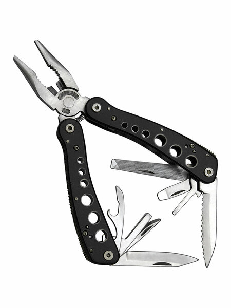 Мультитул с восемью предметами и набором бит в нейлоновом чехле. Включает в себя пассатижи, нож, серейтор, консервный нож и открывалку для бутылок, две шлицевых отвертки, шило, напильник и не большую линейку. Все предметы расположены в рукоятках пассатиж, а обойма с битами размещается в чехле.