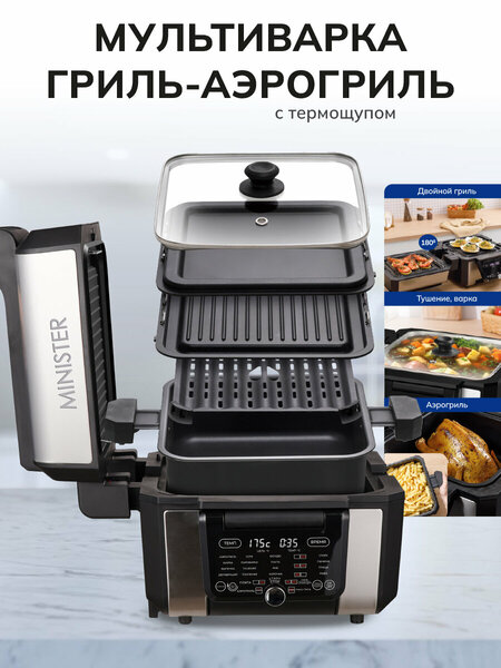 Мультиварка‑гриль MINISTER: три прибора в одном — для кулинарных открытий каждый день Забудьте о захламлённой кухне и множестве приборов — MINISTER ("Министр") объединяет функционал мультиварки, аэрогриля и контактного гриля в одном компактном корпусе. С этим устройством вы легко приготовите и нежные тушёные блюда, и запечённые с хрустящей корочкой деликатесы, и сочные стейки с характерными полосками от гриля. Это идеальное решение для тех, кто ценит многофункциональность, экономит пространство и хочет разнообразить своё меню без лишних затрат. Мощность в 1500 Вт обеспечивает быстрый нагрев и стабильную работу прибора даже при максимальных нагрузках. Благодаря этому блюда готовятся заметно быстрее, а температура поддерживается равномерно на всём протяжении процесса. Такая производительность особенно важна для режимов гриля и аэрогриля, где требуется интенсивный и точный нагрев для идеальной прожарки и образования аппетитной корочки. Вместительная чаша на 6 литров позволяет готовить блюда на всю семью или для праздничного стола без необходимости многократной загрузки. Антипригарное покрытие не только защищает пищу от пригорания, но и существенно упрощает уход: еда не прилипает, а очистка занимает минимум времени. Вы можете готовить с минимальным количеством масла, делая блюда более здоровыми, при этом сохраняя их сочность и насыщенный вкус. В комплект входят съёмные двусторонние пластины: одна сторона — рифлёная (для создания классических полосок на мясе и овощах), другая — гладкая (для равномерного обжаривания сэндвичей, панини и других блюд). Установка пластин занимает считанные секунды — и ваша мультиварка мгновенно превращается в гриль. С ними вы сможете экспериментировать с рецептами, получая ресторанные результаты прямо у себя на кухне. Панель управления разработана для удобства - логичная структура меню позволяют быстро освоить все функции. Функция отсрочки старта даёт возможность подготовить ингредиенты заранее и задать время начала готовки — блюдо будет готово к нужному часу. Режим подогрева сохранит еду тёплой до вашего прихода, не пересушивая её. Эти опции делают приготовление пищи гибким и подстраивают прибор под ваш ритм жизни. Прибор оснащён 12 автоматическими программами для самых популярных блюд: супы, каши, выпечка, тушение и др. Каждая программа автоматически подбирает оптимальные параметры, избавляя вас от необходимости следить за процессом. Кроме того, есть ручной режим, где вы можете самостоятельно задать температуру и время готовки. Это открывает простор для кулинарных экспериментов: адаптируйте рецепты под свои предпочтения, создавайте авторские блюда и добивайтесь идеального результата каждый раз. В набор входит термощуп, который позволяет контролировать внутреннюю температуру продуктов в реальном времени. Это особенно важно при приготовлении мяса, птицы и рыбы: вы можете быть уверены, что блюдо достигнет нужной степени прожарки без риска пересушивания. Просто вставьте щуп в продукт, выберите режим — и мультиварка сама определит момент готовности, автоматически завершив процесс. Такой подход гарантирует безупречный результат и помогает сохранить сочность и питательные свойства продуктов. Уход за прибором максимально упрощён: съёмная чаша, двусторонние пластины, крышка и другие эл