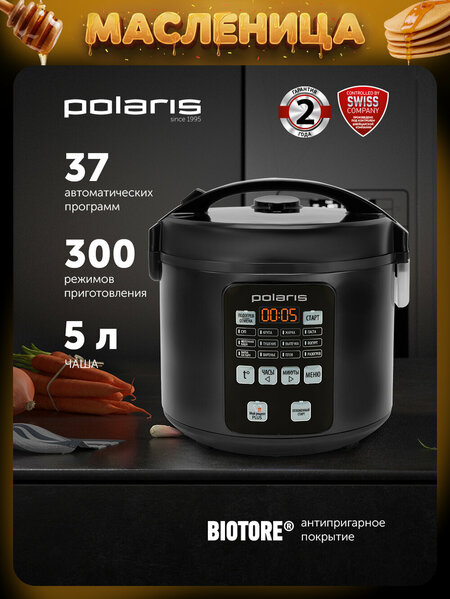 Мультиварка Polaris PMC 0593AD создана для тех, кто ценит своё время и хочет готовить еду быстро и просто. С функцией «Отложенный старт» можно установить таймер до начала приготовления блюда в течение 24 часов. Мультиварка с антипригарной чашей на 5 литров имеет 48 автоматических программ приготовления, которые обеспечат и разнообразие блюд. В памяти мультиварки программы: мой рецепт plus, суп, крупа, жарка, паста, молочная каша, тушение, выпечка, йогурт, варка на пару, варенье, плов, разогрев и другие программы. Сохранить любимый рецепт и настроить под него мультиварку можно через функцию «Мой Рецепт PLUS». Искать рецепты для приготовления в мультиварке не придётся — повара журнала «Гастроном» разработали книгу разнообразных рецептов. Чаша для мультиварки изготовлена из лицензионного антипригарного покрытия Biotore, оно обладает прочностью, безопасно для здоровья и устойчиво к царапинам. Объем чаши позволяет приготовить до 10 порций и ее можно мыть в посудомоечной машине. Если ребёнок попытается открыть включённое устройство, при активной функции «Защита от детей», мультиварка сообщит о такой попытке звуковыми сигналами. Если вдруг отключат электричество, то мультиварка сохранит программу ещё 20 минут. Мультиварка настраивается через электронную панель управления: выбираете программу в разделе «Меню», задете необходимое время работы и температуру. В случае неисправности гарантия на мультиварку действует 2 года. В комплекте к устройству идёт всё самое необходимое: мультиварка, внутренняя чаша для мультиварки, пароварка, мерная чаша, плоская ложка для перемешивания и глубокая ложка для супа, а также наша уникальная книга рецептов, разработанная поварами журнала «Гастроном». Вместе с умной техникой для кухни Polaris готовка станет простой и быстрой!