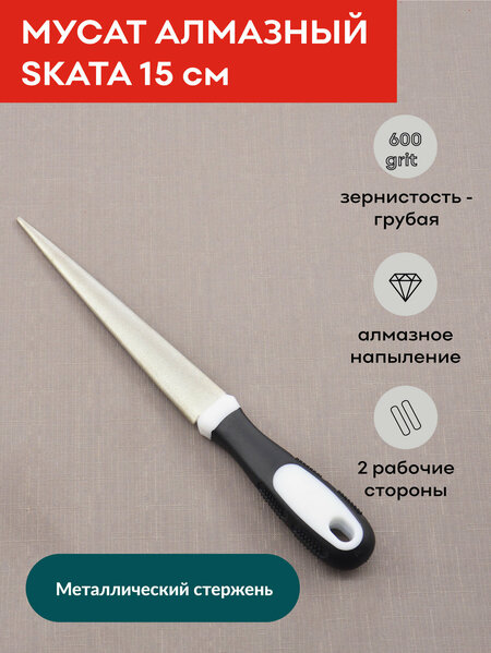 Достоинства:Качество материала. Мусат сделан из высококачественного алмазного порошка, что весьма заметно при его использовании. Он хорошо точит ножи, делая их острыми и ровными.