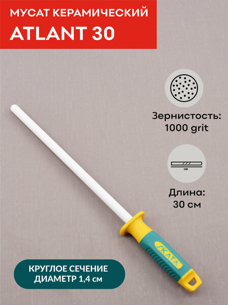Длина мусата ATLANT - 30 см, что позволяет править ножи любой длины: от овощного до самого большого шеф-ножа.