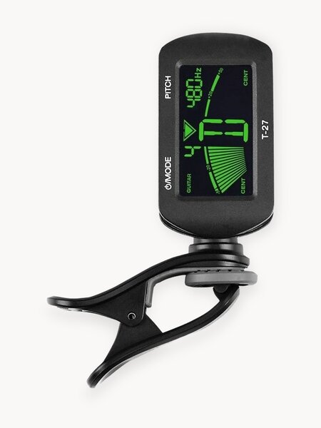 T-27 Тюнер на прищепке, Musedo Функция автоотключения. Тюнер выключается автоматически после 5 минут отсутствия сигнала. Функция сохранения настроек после автооткоючения. Режимы настройки: хроматическая, гитара, бас-гитара, скрипка, укулеле. Поворачивающийся на 360 градусов LCD дисплей с подсветкой. Диапазон настройки: Ля субконтр октавы (A0, 27,5Гц) – До пятой октавы (С8, 4186Гц) Калибровка А4 (Ля первой октавы): 430-450Гц (шаг 1Гц) Определение звука: клипса (пьезодатчик) Время отклика: 20мс Точность настройки: ±1cent Питание: 3V (CR2032) литиевая батарея