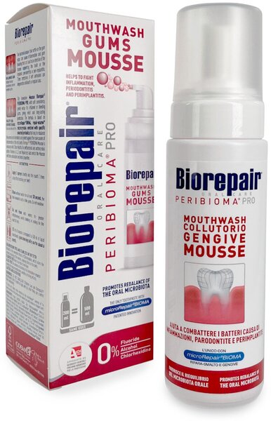 Рекомендуется использовать мусс Biorepair для ухода за дёснами после каждого приёма пищи и чистки зубов, а также в сочетании с зубной пастой Biorepair Peribioma и жевательной резинкой Biorepair Peribioma.