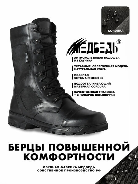 Качественные Мужские Берцы М-15 повышенной комфортности от Обувной Фабрики Медведь - это комфортная и надежная модель для охоты, активного отдыха и туризма. Пользуется популярностью у спецструктур, охранных предприятий, мчс и мвд. Берцы мужские демисезонные М-15 как их ещё называют "Окошки" имеют необычный дизайн. Данная модель военных берц имеет отличие от своих копий тем, что она полностью доработана и максимально комфортна для ношения! Тактические ботинки представлены в базовом чёрном цвете и выполнены из натуральной кожи высшего качества. Сетчатый подклад предотвратит скольжение ноги во время движения, обеспечит дыхание ног и повышенный теплообмен. Усиленный подносок и подпяток амортизируют движения и сберегут ваши ноги от всевозможных травм. Для усиления устойчивости и дополнительной защиты у демисезонных берцев используется плотная подошва из каучука повышенной износостойкости. Вы всегда можете связаться с нами через кнопку "Написать в Магазин" для получения ответов на возникшие вопросы. Производятся эти берцы в России, что гарантирует высокое качество и оптимальное соотношение цены и надежности. Обувная фабрика «Медведь» тщательно контролирует каждый этап производства, чтобы предоставить клиентам обувь, соответствующую самым высоким стандартам. Берцы мужские демисезонные из натуральной кожи — это надежная, долговечная и удобная обувь для любых условий, обеспечивающая комфорт и защиту на долгие годы, как для мужчин, так и для женщин.