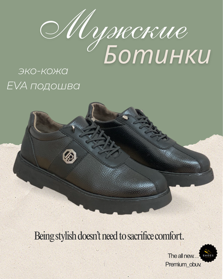 Мужские ботинки: комфорт и надежность Прочная ЭВА-подошва: мужские ботинки оснащены прочной ЭВА-подошвой, которая обеспечивает надежное сцепление с поверхностью и снижает нагрузку на стопы. Верх из эко-кожи: верх ботинок выполнен из качественной эко-кожи, которая устойчива к износу и проста в уходе. Водонепроницаемая конструкция: водонепроницаемая конструкция ботинок защищает ноги от влаги и грязи, обеспечивая комфорт в любую погоду. Легкая и прочная подошва: легкая и прочная подошва из ЭВА хорошо амортизирует, снижает нагрузку на стопы и предотвращает скольжение. Мужские ботинки отлично подойдут для города, прогулок и активного образа жизни, обеспечивая комфорт и защиту ваших ног в любых условиях.