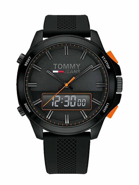Мужские часы Tommy Hilfiger серии Tommy Jeans. Стекло — минеральное. Водонепроницаемость WR30 (3 атм). Бренд Tommy Hilfiger Страна США Пол Мужской Стиль Повседневные, Спортивные Стекло минеральное повышенной прочности Браслет силиконовый ремень Габариты 45 мм Механизм кварцевый Цвет циферблата черный Цвет корпуса черный Цвет браслета черный Форма циферблата круг Тип маркировки на циферблате метки Толщина корпуса 9 мм Вес часов 88 Ширина ремешка 22мм Тип замка классический
