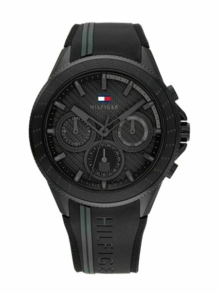 Мужские стильные часы на резиновом ремешке с календарем. Эта инновационная модель для мужчин, которые любят оригинальные трендовые вещи. Бренд Tommy Hilfiger Страна США Пол Мужской Стиль Повседневные, Спортивные Стекло минеральное повышенной прочности Браслет силиконовый ремень Механизм кварцевый Габариты 43 мм Цвет циферблата черный Цвет корпуса черный Цвет браслета черный Форма циферблата круг Тип маркировки на циферблате метки Толщина корпуса 9 мм Вес часов 88 Ширина ремешка 22мм Тип замка классический