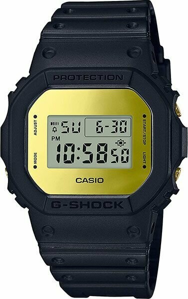 Черные матовые джишоки в олдскул корпусе из серии G-SHOCK DW-5600 с зеркально-золотой окантовкой циферблата, выпущены к 35-ти летию G-SHOCK. G-Specials Metallic Mirror Face. Лимитированная серия часов с оригинальным зеркальным кантом. Для достижения максимально эффекта зеркальной поверхности, с переливами и красивыми рефлексами от света, Casio нанесли с помощью напыления светоотражающие частицы краски прямо на внутреннюю поверхность стекла. Благодаря этому окантовка циферблата, в зависимости от освещения, может выглядеть от светло-золотого до абсолютно черной. Противоударный корпус защищает механизм от ударов и вибрации. Электролюминесцентная подсветка освещает весь циферблат, после отпускания кнопки свечение продолжается еще некоторое время. 12-ти и 24-х часовой формат времени. Секундомер с двумя точностями показаний: 1/100с (до 1ч) и 1с (после 1ч) и временем измерения 24ч. Сплит-хронограф. Таймер обратного отсчета от 1мин до 24ч с автоповтором. Типы сигналов: ежедневный, ежемесячный, каждый день определенного месяца, на определенную дату. Световая индикация сигнала.