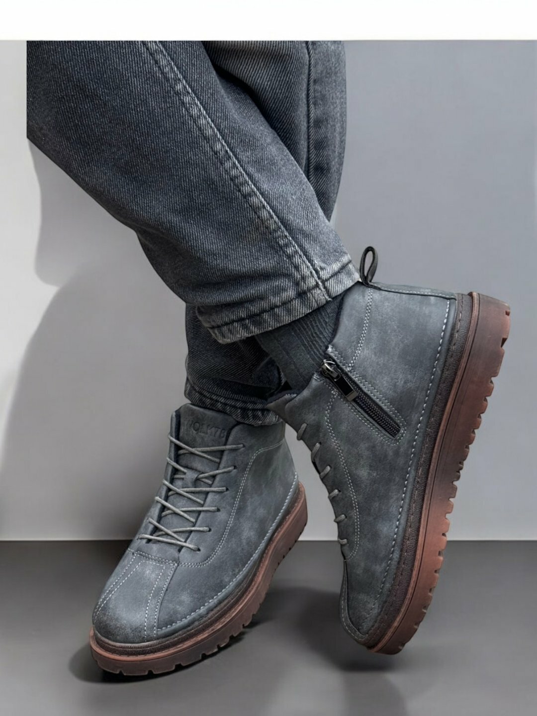 мужские ботинки из прочной экокожи, водоотталкивающий верх, внутренняя отделка из мягкого начеса, плотная прошитая подошва, обеспечивает тепло и комфорт в холодное время года, устойчивая нескользящая подошва, классический дизайн, представлены в черном и сером цвете, подходят для осени и зимы, удобно сидят на ноге, стильная универсальная модель