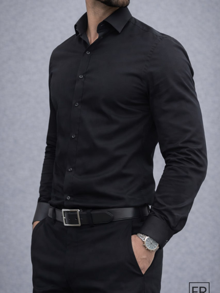 Черная классическая рубашка в минималистичном стиле. Приталенный крой, аккуратный пошив и комфортная ткань. Отличный выбор для офиса, деловых встреч и торжественных мероприятий. Мужская чёрная классическая рубашка — стильный выбор для уверенного образа. Чёрный цвет подчёркивает строгость и элегантность. Изготовлена из качественной ткани, обеспечивающей комфорт в течение всего дня. Приталенный (slim fit) крой подчёркивает мужской силуэт. Подходит для офиса, деловых встреч, вечерних мероприятий и повседневного ношения. Манжеты аккуратно обработаны, пуговицы прочные и долговечные. Преимущества Универсальный чёрный цвет Современный приталенный крой Дышащий материал Качественный пошив Подходит для делового и повседневного стиля Характеристики Тип товара: Мужская рубашка Цвет: Чёрный Воротник: Классический Рукав: Длинный Крой: Slim fit Стиль: Классический / Деловой / Casual Сезон: Весна / Осень / Зима Тип застёжки: На пуговицах Уход: Стирка при 30°C