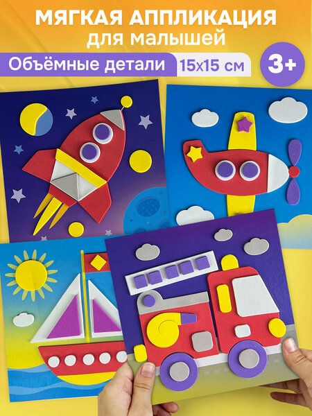 Аппликация - один из основных видов творчества для самых маленьких детей. Он оказывает огромное влияние на развитие умственных и творческих способностей, мелкой моторики, внимательности и усидчивости. В наборе вы найдёте всё, что нужно для создания забавной мягкой картинки: вам не понадобятся дополнительные материалы, клей или ножницы. Чтобы наклеить деталь, нужно просто снять с липкого слоя защитную плёнку и приложить деталь в нужное место картинки. Яркие, простые иллюстрации прекрасно подходят для первого знакомства малыша с аппликацией. В наборе 4 картинки-основы для аппликации с изображениями транспорта: кораблика, самолёта, ракеты и пожарной машины. Набор для творчества будет особенно интересен мальчикам. В наборе: - 4 цветные основы с рисунком-схемой, - детали из ЭВА на самоклеящейся основе (6 цветов), - декоративные элементы на самоклеящейся основе (глазки), - цветная листовка-образец. Возраст: от 3 до 5 лет. Размер аппликации: 15х15 см. Размер упаковки: 31х20х0,7 см.