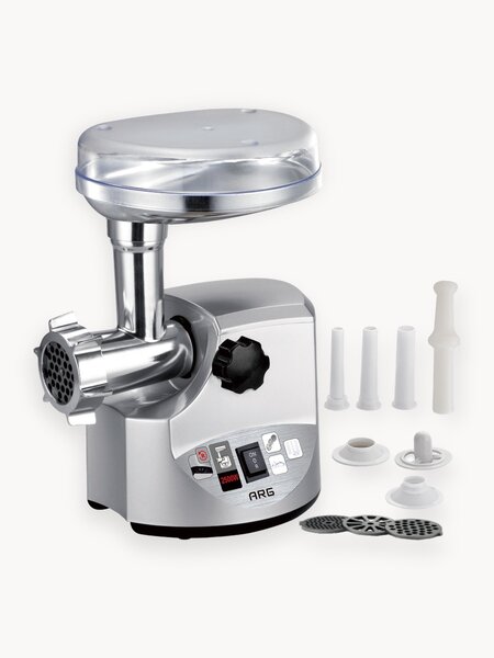 Электромясорубка ARG M-198Р станет вашим верным помощником: благодаря мощному мотору она производит 2.5 кг фарша в минуту. В комплект входят три решётки с отверстиями различного диаметра. Котлеты, запеканки и бифштексы получатся с дисками 5 и 7 мм, а паштет или тефтели для детского питания – с 3 мм. А ещё вы сможете набить домашние колбаски и приготовить кеббе – трубочки из мясного фарша с разнообразными начинками. Соответствующие насадки прилагаются. Прокручиваете жёсткое, жилистое мясо, волокна которого блокируют шнек? Активируйте реверс, и вам не понадобится возиться с разборкой рабочей камеры. Загрузочный лоток позволяет ускорить процесс и поместить к входному отверстию больше кусочков. Для их «утрамбовки» используйте толкатель. Максимальная мощность: 2500 Вт • Производительность: 2.5 кг/мин • Защита двигателя от перегрузки: Да • Насадка для терки: Нет • Количество насадок: 2 • Комплектация: Мясорубка, насадки для колбас и кеббе, толкатель, решётки 3 шт, кольцевая гайка, нож, загрузочный лоток, загрузочная горловина, инструкция