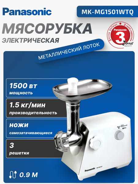 Мясорубка Panasonic MK-MG1501WTQ - это мощный и надежный помощник на вашей кухне. Мощность и производительность: Номинальная мощность мясорубки составляет 240 Вт, а максимальная мощность достигает 1500 Вт. Это позволяет ей справляться с мясом любой жесткости и быстро перерабатывать его в фарш. Максимальная скорость работы составляет 1.5 кг/мин, что обеспечивает быстрое и качественное измельчение продуктов. Корпус и материалы: Корпус мясорубки выполнен из пластика, что делает ее легкой и удобной в использовании. Пластик также обеспечивает долговечность и надежность устройства. Насадки и диски: В комплекте с мясорубкой идут 3 перфорированных диска, которые позволяют регулировать степень измельчения мяса. Это позволяет приготовить фарш нужной консистенции для различных блюд. Безопасность и продолжительность работы: Максимальное время непрерывной работы мясорубки составляет 15 минут, что позволяет избежать перегрева двигателя и продлить срок службы устройства. Длина сетевого шнура составляет 0.9 метра, что обеспечивает удобство при использовании и возможность подключения к различным розеткам. В целом, мясорубка Panasonic MK-MG1501WTQ - это надежный и мощный инструмент для приготовления фарша, который станет незаменимым помощником на вашей кухне.