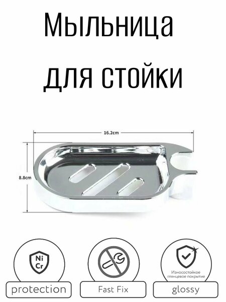 Мыльница 16,2x8,8 см, диа. для установки на душевую стойку диаметром 22 и 25мм (демонтаж стойки для установки не требуется) Материал корпуса: ABS-пластик, хром