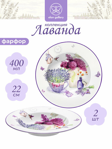 Набор 2 суповых тарелок Elan Gallery "Лаванда" выполнен из фарфора new bone china, сочетающего в себе изящность и высокую прочность. Размер каждого изделия — 22х22х4 см, объём – 400 мл. За счёт гладкости изделия легко отмываются, поэтому долго сохраняют привлекательный вид и практичны в использовании. Плотная структура материала позволяет посуде дольше сохранять температуру блюд и напитков. От других видов костяного фарфора new bone china отличается большей экологичностью в производстве. Серия "Лаванда" украшена нежным принтом на тему Прованса – французской провинции, которая славится своими лавандовыми полями и красивыми пейзажами. Изображение пышных букетов лаванды и гортензии позволит окунуться в атмосферу тепла, гармонии и южного солнца, не покидая вашей кухни или столовой! Фарфоровая посуда с цветочным рисунком станет изящным дополнением интерьера любой кухни или столовой. Глубокие тарелочки подойдут для подачи супов, бульонов и каши. Эргономичная форма позволяет использовать их не только для первых блюд, но и рагу, салатов и пасты. Красивые блюда подойдут для сервировки как на праздник, так и в будни. Не рекомендуется применять абразивные моющие средства. Подходит для использования в посудомоечной машине и микроволновой печи. Поставляется в красивой картонной коробке – благодаря ей вам не потребуется дополнительная подарочная упаковка. Набор станет оригинальным подарком для любой хозяйки и незаменимым элементом сервировочного инвентаря в вашем доме!