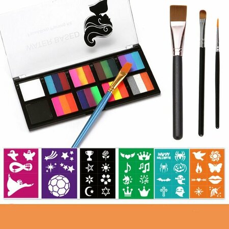 Аквагрим для праздников для детей и взрослых. Удобная палетка с тройными цветами обеспечивает интересное сочетание оттенков для Ваших эскизов. В наборе идут 4 кисти и шаблоны