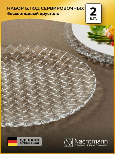Универсальная тарелка плоская очень красиво смотрится на столе и стильно сочетаются с любым декором. Хрустальные тарелки подставочные идеальные на каждый день. Набор стеклянных тарелок 2 шт, посуда из стекла, тарелка стеклянная подставочная, посуда столовая, посуда сервировочная. Потрясающая коллекция посуды Bossa Nova от Nachtmann включает в себя блюда, салатники, тарелки и другие изделия различных форм и размеров. Удивительный дизайн в виде плетеного орнамента из кристаллов превращает каждый предмет этой коллекции в настоящее художественное произведение, а особая технология гравировки создает неповторимый блеск и завораживающие переливы при попадании света. Диаметр блюда: 32 см. Материал: бессвинцовый хрусталь.
